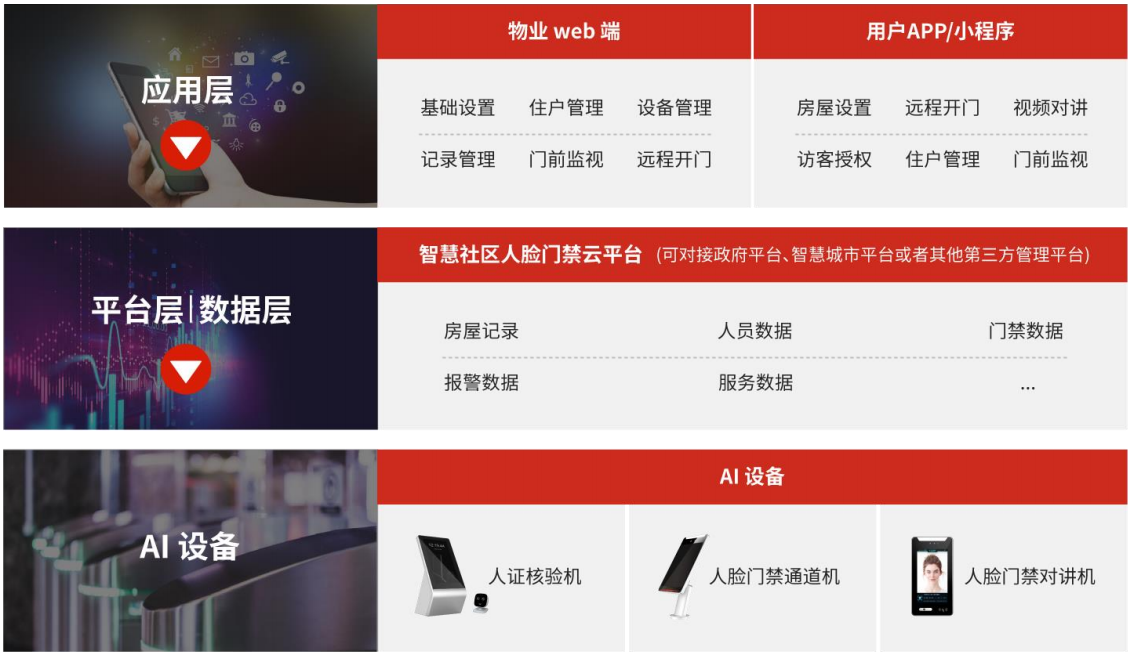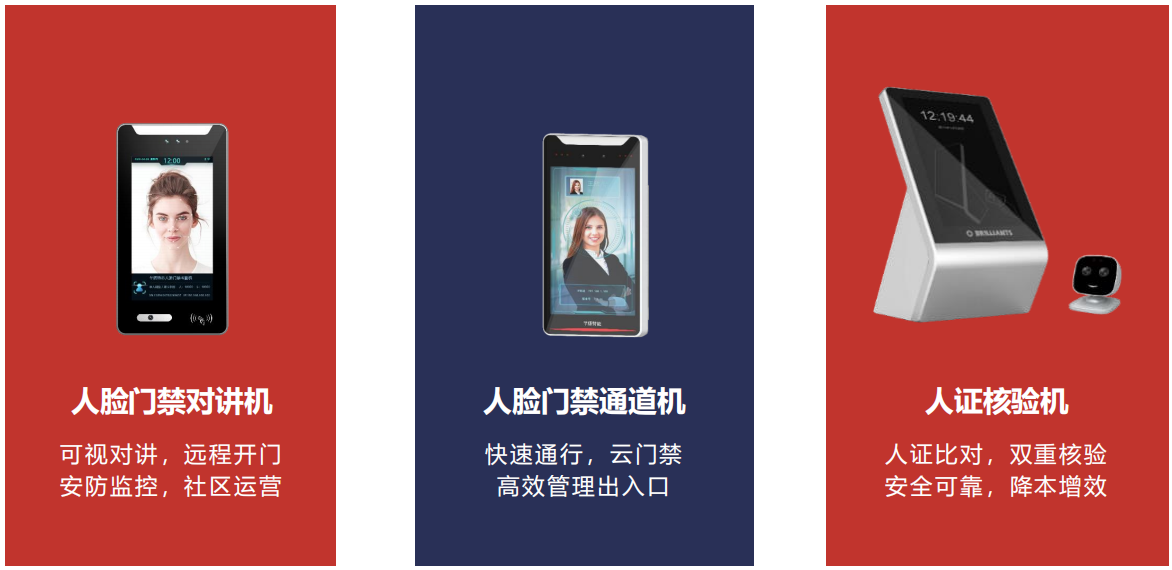 ? 產品:基于智慧社區人臉門禁云平臺(以PC端瀏覽器、APP、小程序為功能載體),聯通各智能硬件終端(人臉門禁對講機、人臉門禁通道機和人證核驗機等),實現人臉開門、人臉考勤、人證核驗、對講開門、人員管理、訪客管理、權限管控、設備管理等一體化智能應用及高效管理,全面滿足各出入口的管控需求。