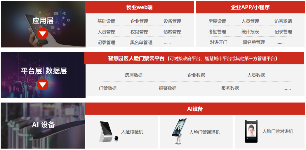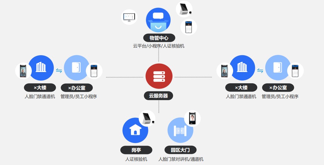 ? 產品:基于智慧園區人臉門禁云平臺(以PC端瀏覽器、APP、小程序為功能載體),聯通各智能硬件終端(人臉門禁通道機、人臉門禁考勤機和人證核驗機等),實現人臉通行、人臉考勤、人證核驗、員工/訪客管理、權限管控、設備管理等一體化智能應用及高效管理,全面滿足各出入口的管控需求。